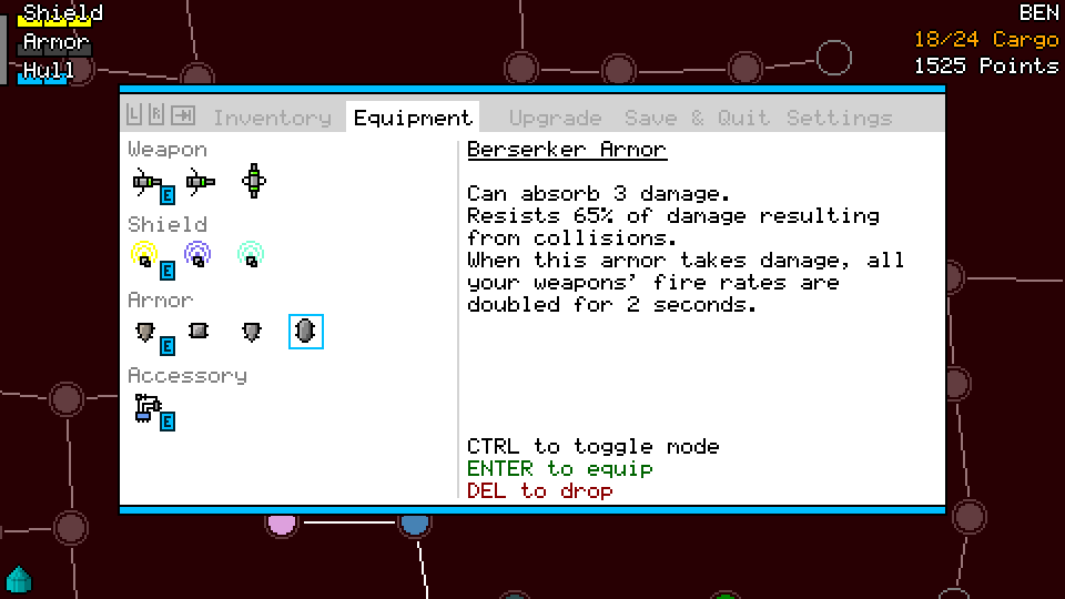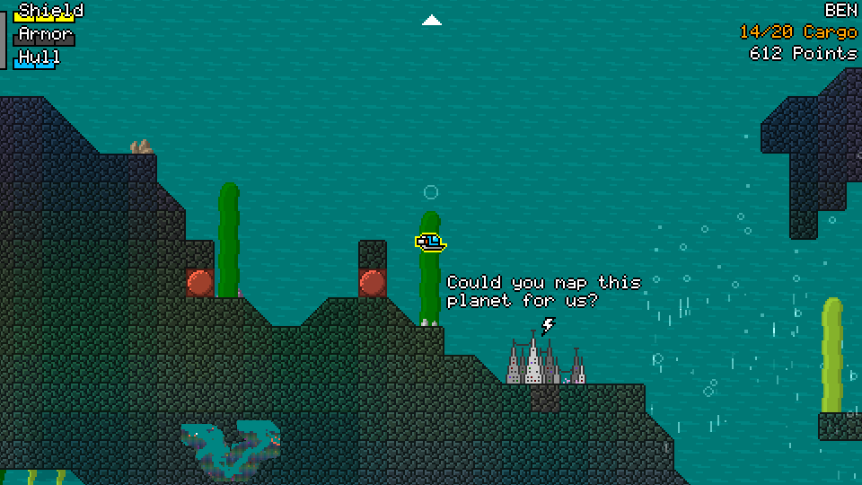 The game today is very unlike the 7DRL entry, though. There were always colorful “potions”, procedurally-generated equipment, and a mysterious/powerful THING for you to find and return with, but I’ve also added a level-up system, procedurally-generated planets, unlockable ships… “just like a Rogue-like!” … except then there’s the whole side-scrolling action shooter-iness of it all…
